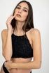 Smooth and stretchy fabric bikini swimsuit sets, comfortable and durable. High-neck halter top embellished with crocheted mesh strips and soft cords with sequins as added sparkle paired with a scrunch bikini. Wash cold, hang dry.