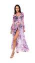 The Flower Long Chiffon Coverup features a delicate floral print in purple, with flowing chiffon fabric and long sleeves, perfect for layering over swimwear or casual wear.