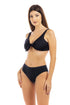 Set di costumi da bagno bikini in tessuto liscio ed elasticizzato, comodi e resistenti.  La scollatura profonda è accompagnata da un'ampia fascia inferiore con chiusure a laccio e abbinata a un bikini scrunch.  Lavare in acqua fredda, appendere ad asciugare.