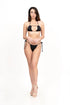 Smooth and stretchy fabric bikini swimsuit sets, comfortable and durable. Trapezoid-shaped bandeau top paired with a tanga bikini bottom and both with adjustable string closures. Wash cold, hang dry.